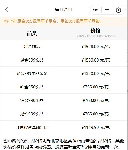 国内各品牌金饰克价水涨船高。9日上午,老庙黄金足金饰品价格为1566元/克;周大福饰品、工艺品类足金价格为1542元/克;周生生足金饰品价格为1568元/克;潮宏基足金(首饰摆件)价格为1542元/克;菜百足金999饰品价格为1530元/克。